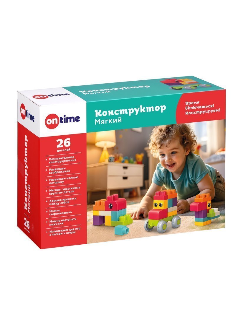 С игровым конструктором OnTime малыш с легкостью соберет забавную машинку с глазками или милых зверят. Детали выполнены из эластичного ПВХ – мягкого и приятного на ощупь тактильного материала, который прекрасно держит форму. Мягкие крупные элементы конструктора безопасны для игры: ребенок не повредит ножку, даже если случайно наступит на них. Конструктор можно использовать для игр с водой и песком. В наборе 26 деталей.