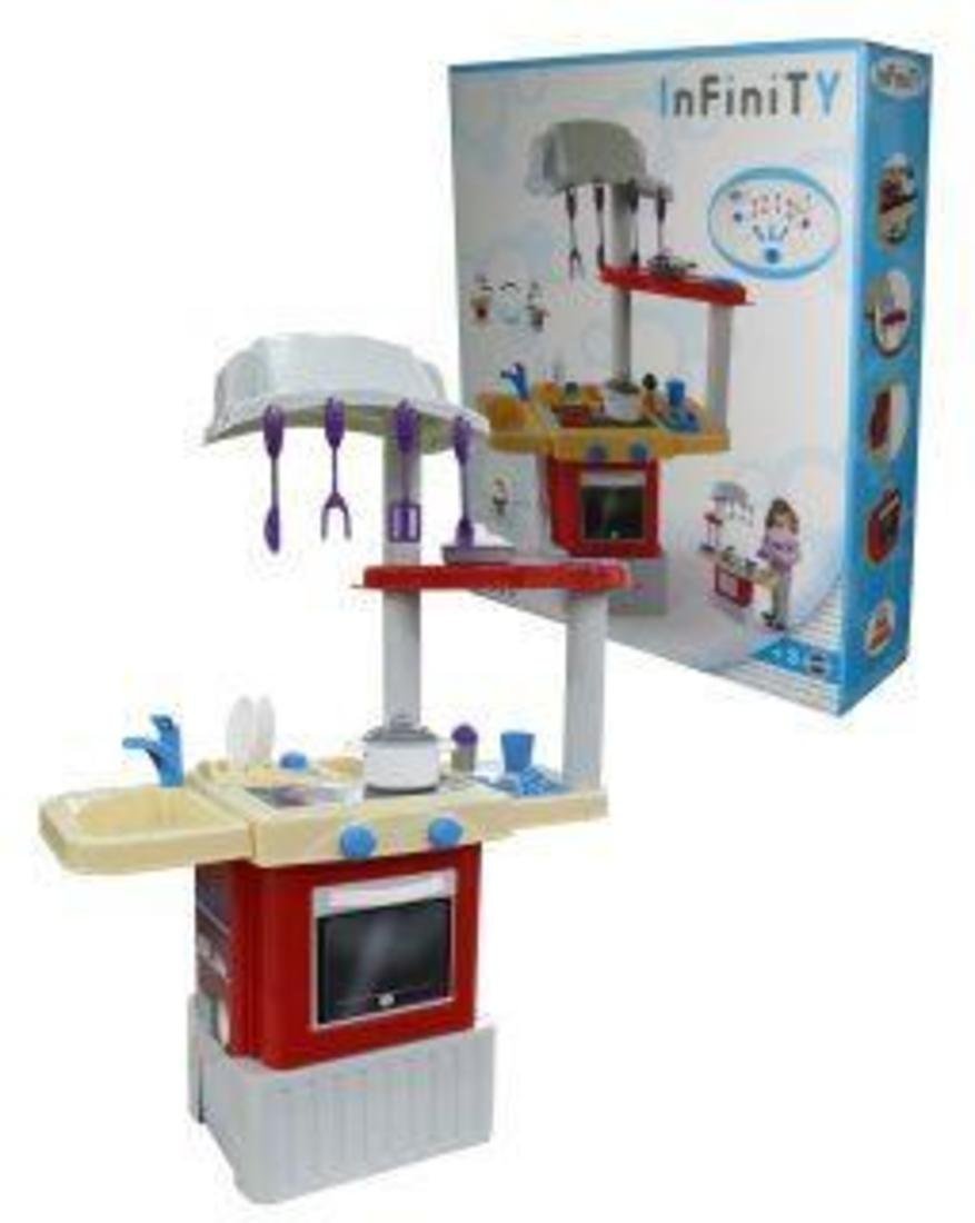 Кухня INFINITY - это подарочный набор кухонных принадлежностей, с которым там интересно играть! Ведь в него включено все, что может понадобиться маленькой хозяюшке. В набор входят различные кухонные принадлежности: ножи, вилки, лопатки, стаканчик, тарелки, сковорода, кастрюля и т.д.