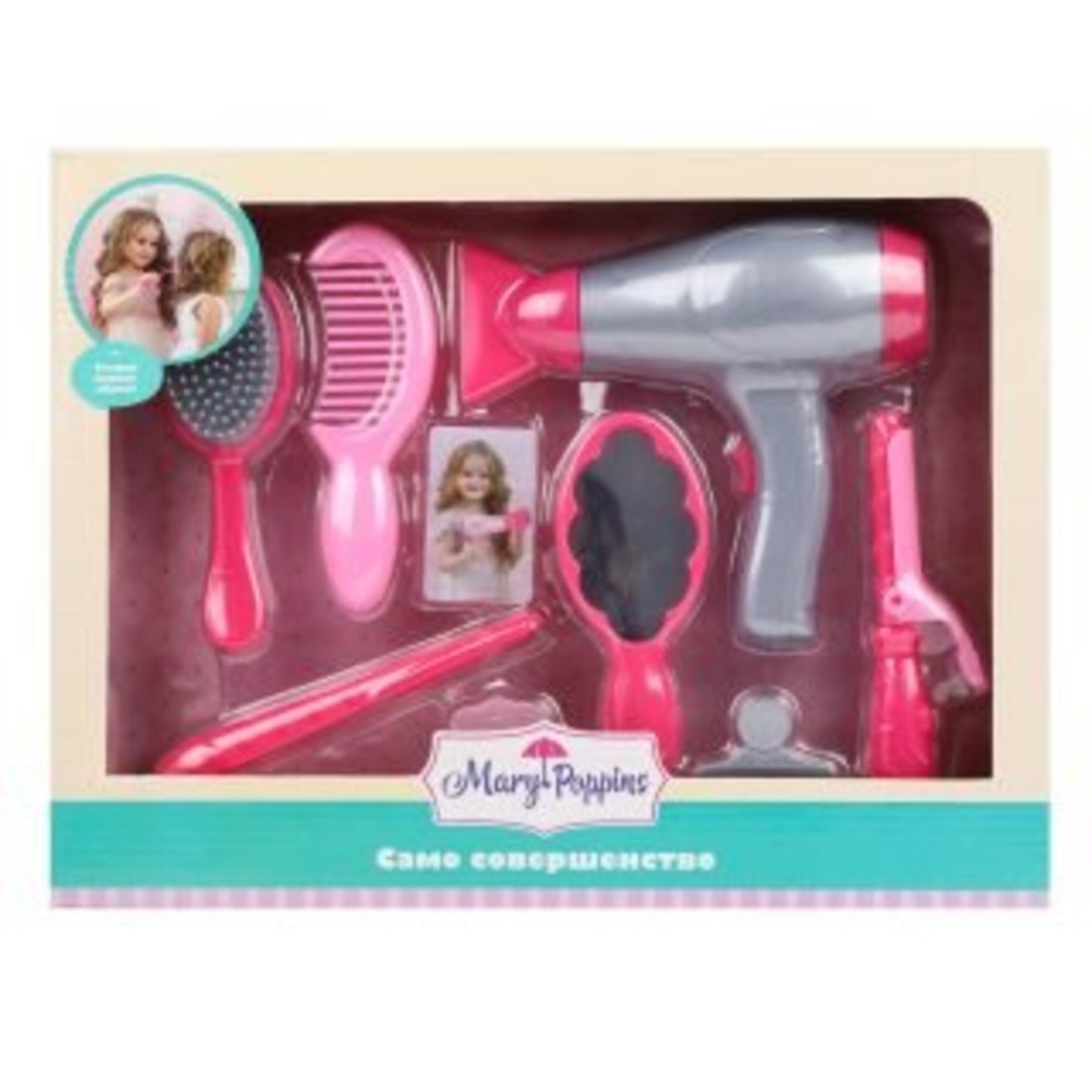 Парикмахерский набор из эксклюзивной коллекции "Само Совершенство" от торговой марки Mary Poppins. В комплекте - 2 игрушечные плойки, 2 расчески, безопасное зеркальце, 2 заколки и фен, который работает почти как настоящий! Игрушки изготовлены из пластмассы с элементами металла. Фен работает от 2-х батареек типа ААА (LR03) на 1,5 V. Элементы питания не входят в комплект. Рекомендованный возраст: 3 года +