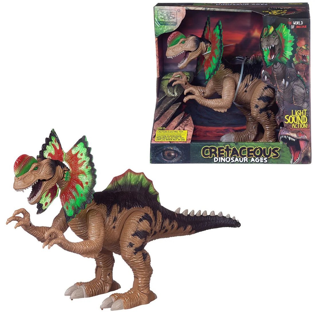 Динозавр Дилофозавр коричневый, движение вперед, свет, звук