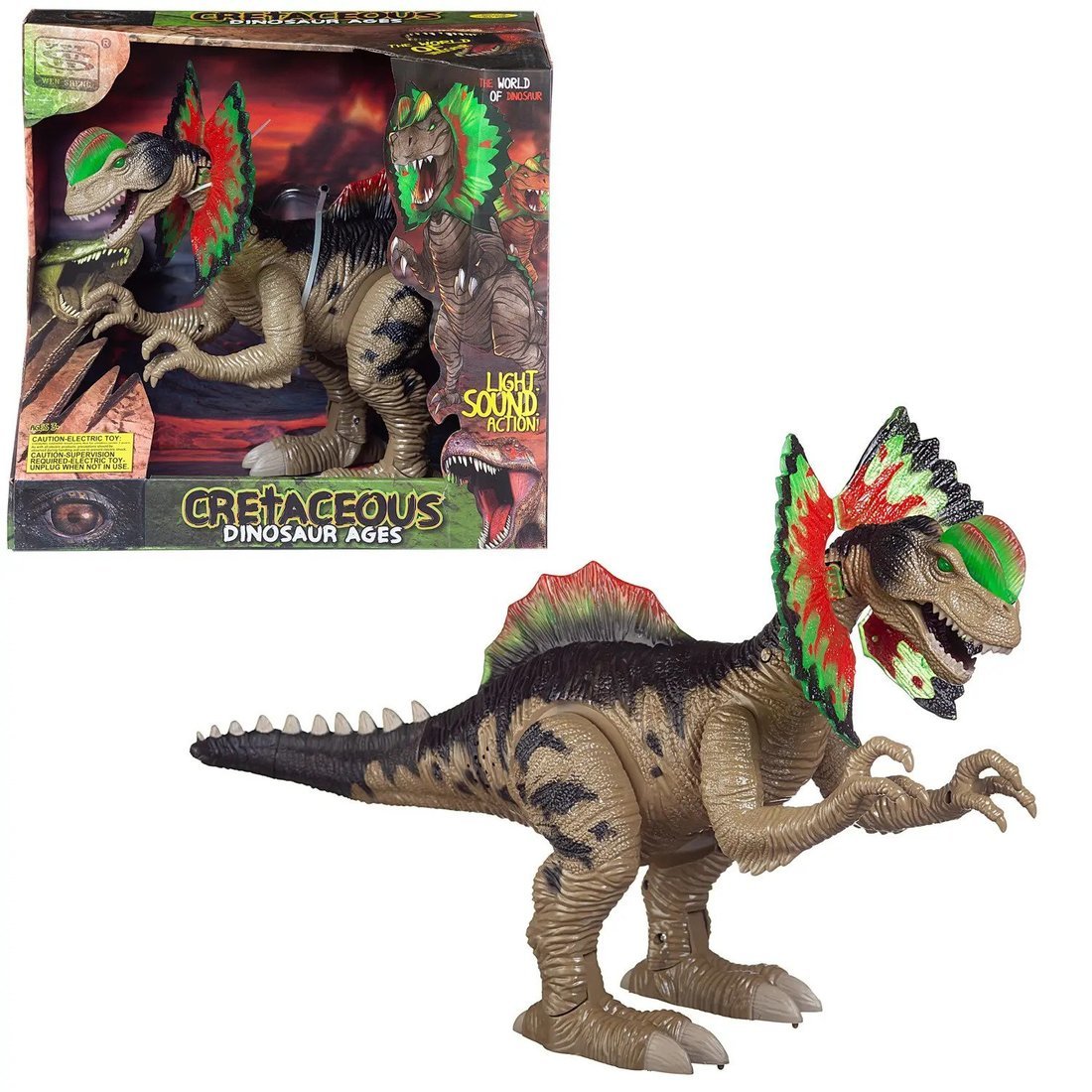 Игрушечный "Динозавр Дилофозавр" очень понравится детям, которые любят доисторических гигантов. Динозавр выглядит очень реалистично, начиная от хищной морды с острыми зубами и ярким воротником, заканчивая хвостом. Играть с таким динозавром будет очень интересно! Ведь он умеет грозно рычать, самостоятельно передвигаться, шагая на задних лапах вперед, шевеля передними и своим восхитительным воротником. Мерцающая подсветка глаз и хохолка на голове сделает игру с ним еще более захватывающей. Игрушка поможет Вашему ребенку переместиться в прошлое, окунуться в мир Юрского периода!