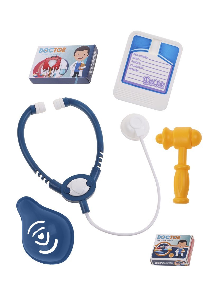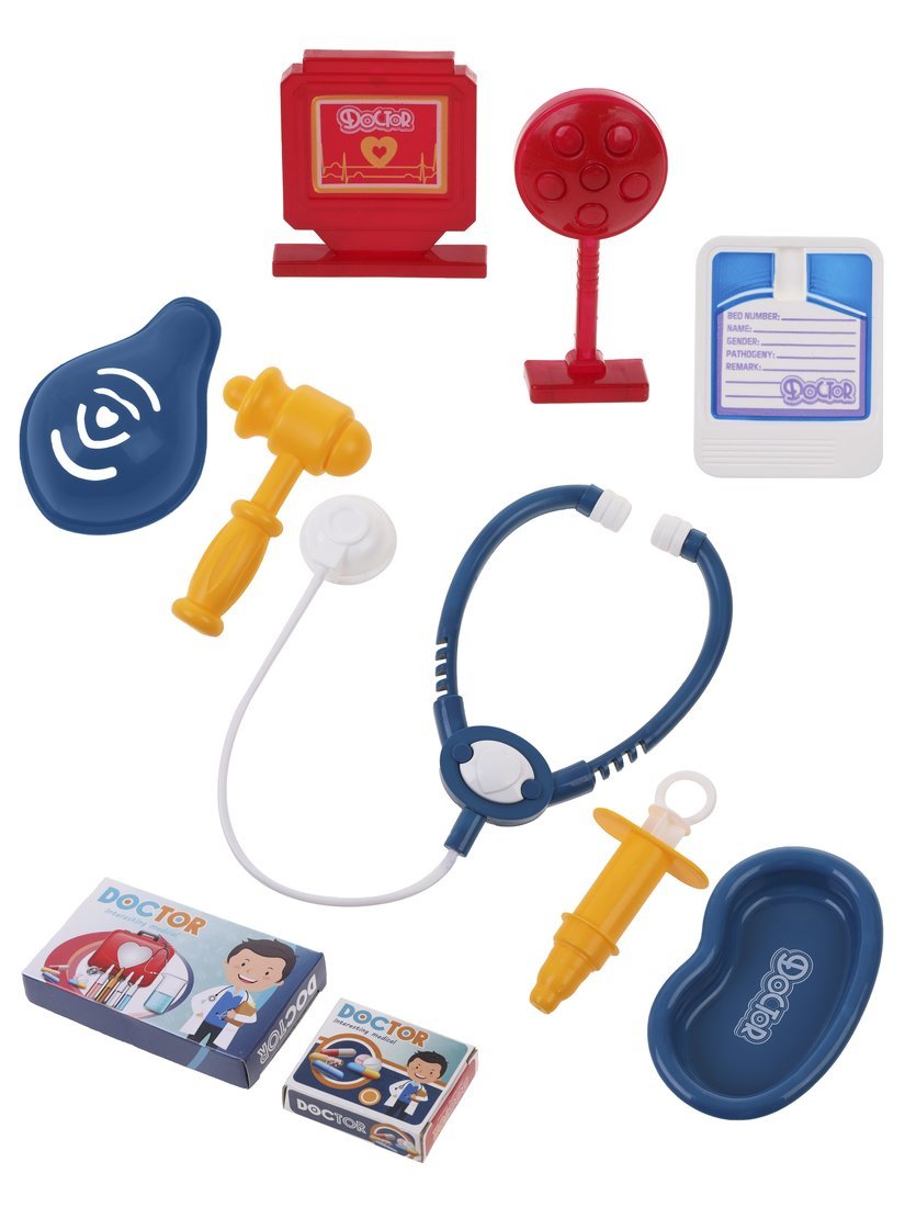 В состав набора вошли: фонендоскоп, лампа, карточка пациента, шприц, 2 коробочки с изображением пилюль, лоток, кислородная маска, монитор, молоточек.