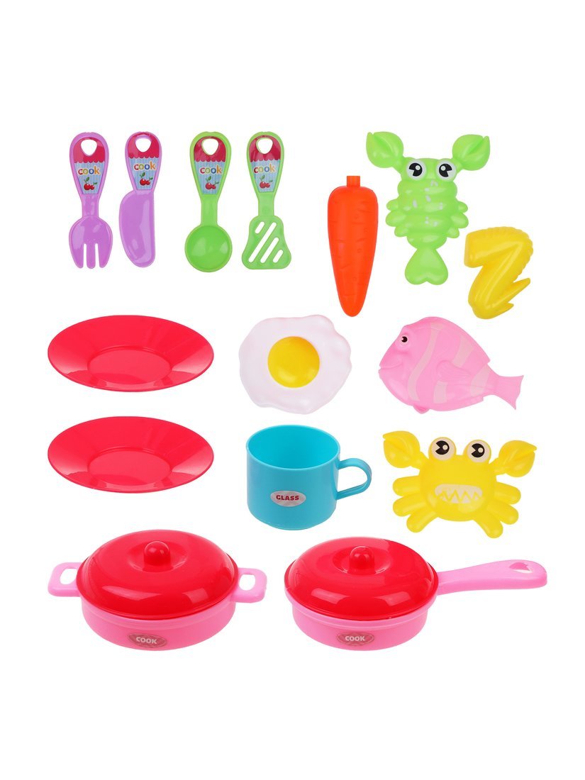 В комплекте прилагаются: посуда, предметы кухонной утвари, тарелки, муляжи морских продуктов, готовых блюд и овощей.