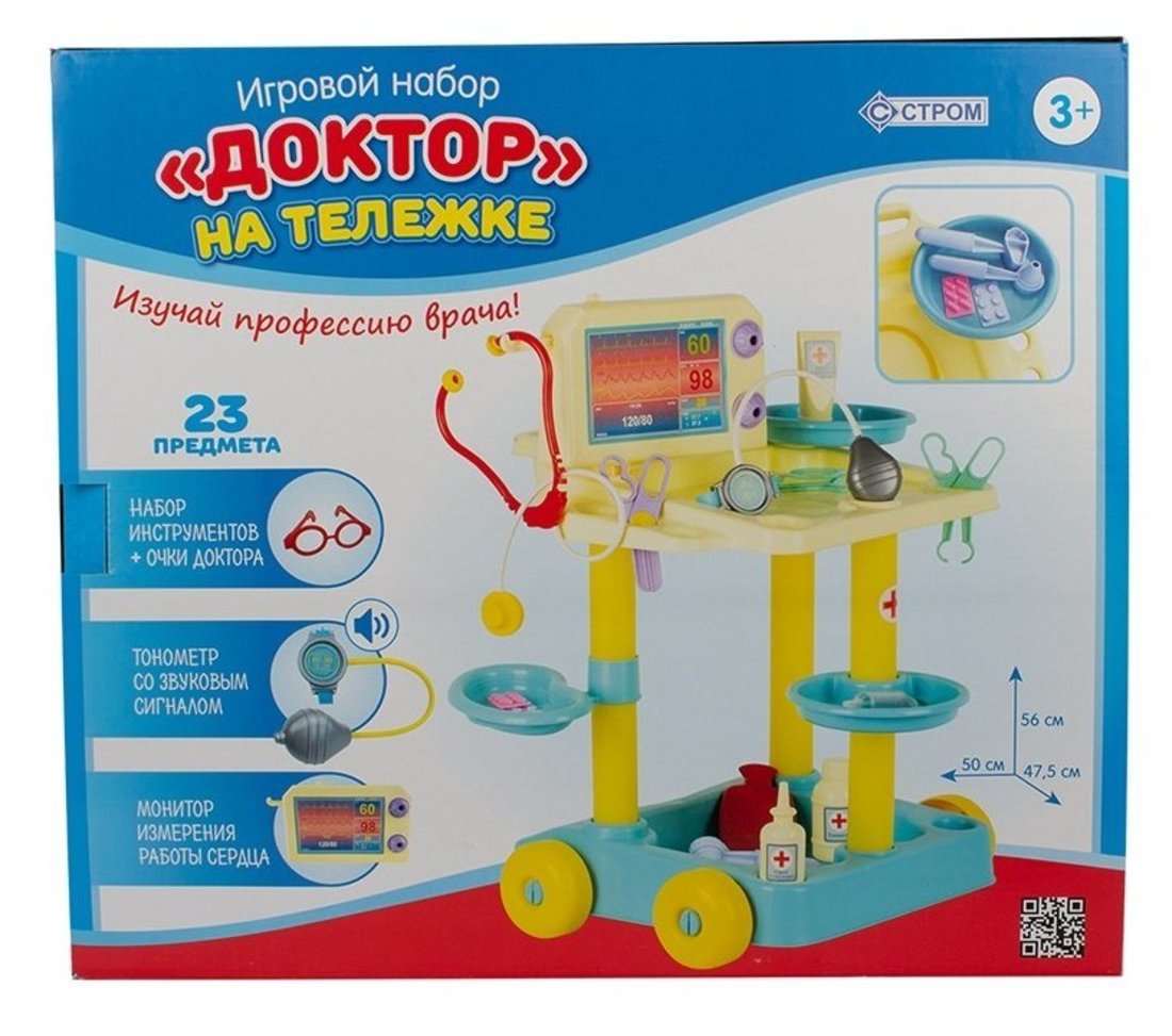 Комплектация: тележка, монитор, ванночка, таблетки 2шт., шприц, щипцы, ножницы, скальпель, термометр,фонендоскоп, тонометр, молоток, ларингоскоп, лопаточка окулиста, грелка, очки, бутылочки 3шт., лотки 3шт..
