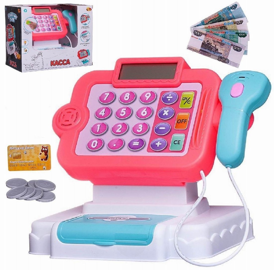 Комплектность: кассовый аппарат со сканером, банковская карта – 2 шт., комплект игрушечных денег.
