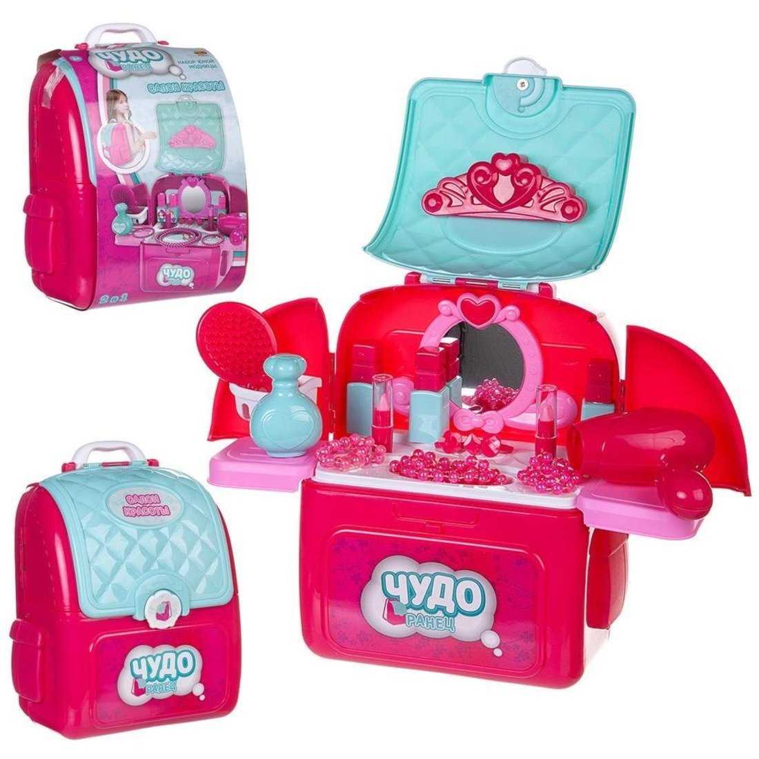 Комплектация набора: ранец пластиковый - 1шт, ремень текстильный для переноски ранца на спине- 1 шт, навесные полки - 3 шт, зеркало (пластик) - 1шт, столешница - 1шт, декоративный элемент для крышки набора - 1 шт, фен - 1шт, расческа - 1шт, косметические флакончики - 4 шт, игрушечная помада - 2 шт, колечки - 3 шт, бусы - 1 шт, браслет - 1 шт.