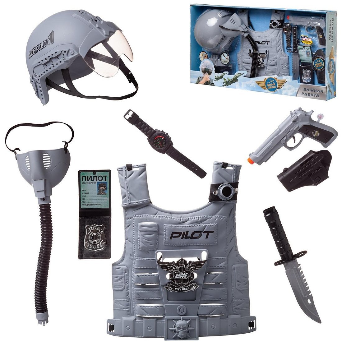 Отличный набор для мальчика, который хочет быть похожим на настоящего военного пилота. Надев на себя жилет, ваш ребенок сможет почувствовать себя настоящим героем и покорителем неба. Каска с защитным экраном и кислородной маской обеспечат его безопасность на экстремальной высоте. Большой пистолет, входящий в состав набора, имеет звуковые эффекты, его можно положить в кобуру. Малыш может вписать свое имя, звание и другие данные в карточку, которая находится в удостоверении с жетоном. Дополняют набор армейский нож и часы. Юный пилот готов нести службу и охранять наше небо!