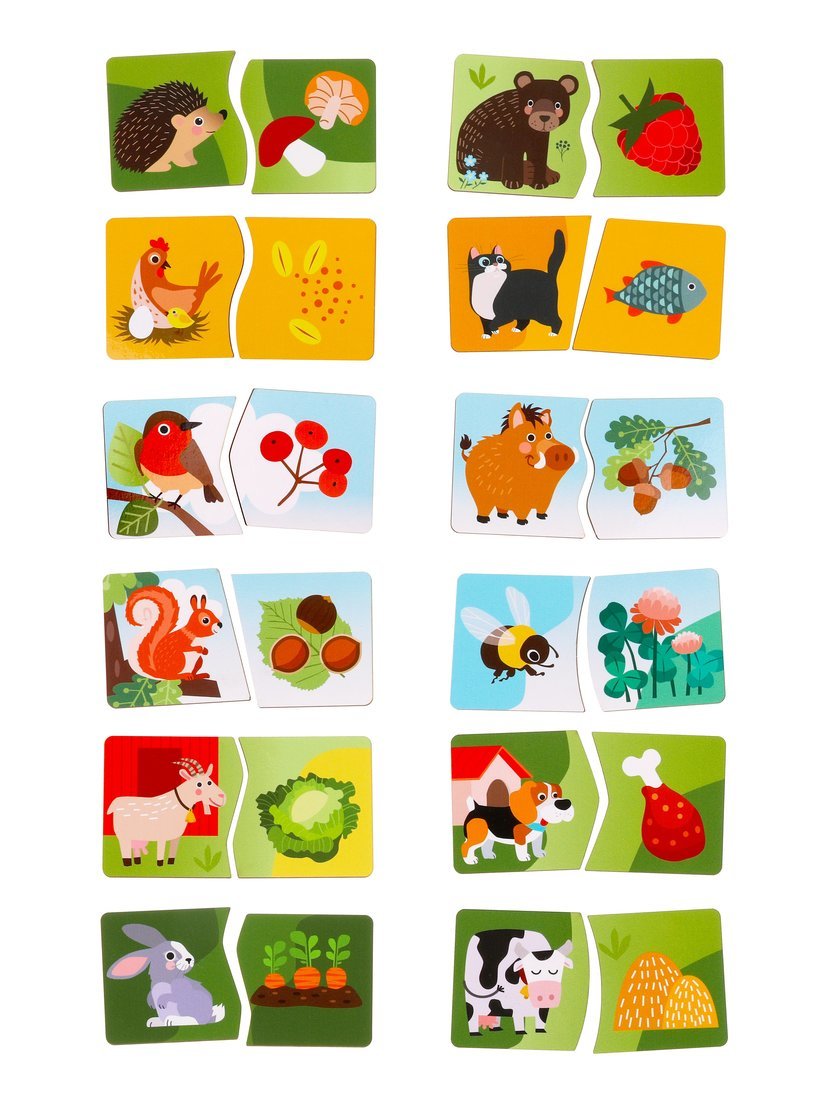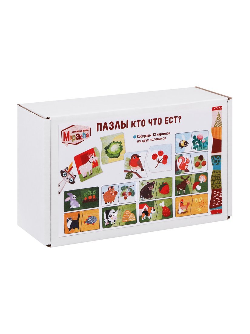 Набор пазлов «Кто что ест?» способствует развитию мелкой моторики, памяти, логики и наглядно-образного мышления малыша. Набор состоит из 24-х деталей – 12-ти пар пазлов с изображением животных: зайчика, котика, медведя, коровки, кабана, собачки, курочки, лося, белочки, пчелы, козы и птицы. Каждый пазл состоит из двух деталей: на одном из элементов изображено животное, а на другом – его любимое лакомство. Задача ребенка – собрать пазл, подобрав для каждого животного подходящую еду.
