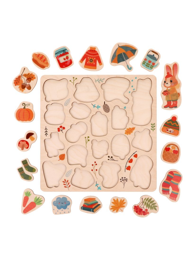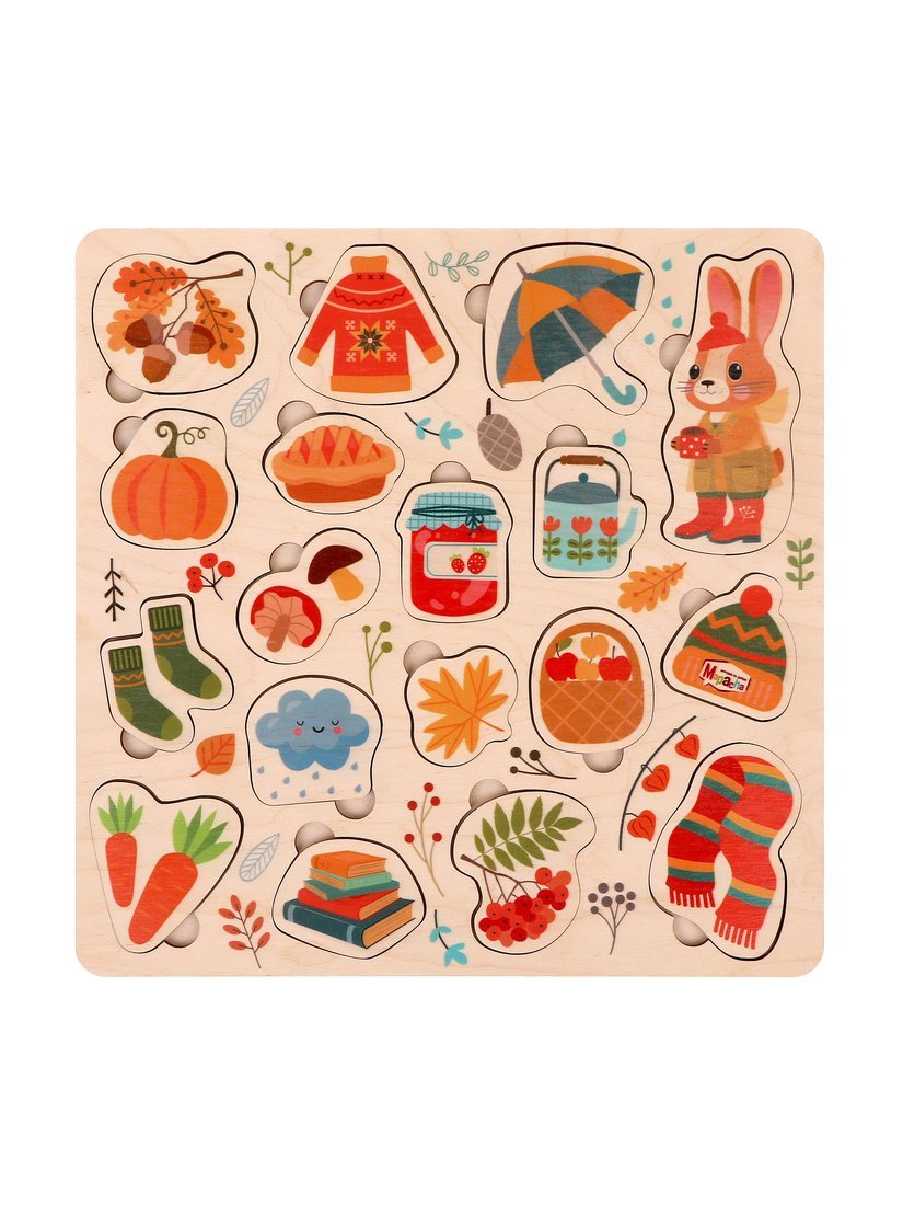 В комплекте – игровое поле с фигурными углублениями и 18 вкладышей с изображением зайца и различных предметов в осенней тематике. Около каждого вкладыша имеется небольшое углубление для пальчиков, благодаря чему вкладыши будет удобно доставать из рамки даже самым маленьким.