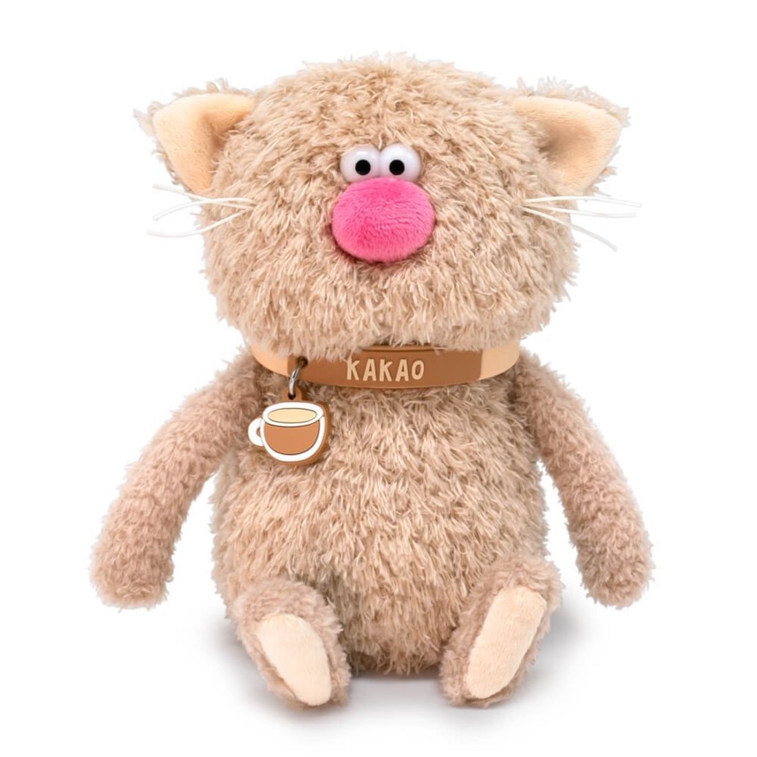 Очаровательный котик Какао из тактильно приятного эко меха цвета какао с молоком. Лапки и хвостик из более короткого меха. Усики из шелковистого крученого шнура. Объемный носик обтянут розовым софтом. Глазки из пластика. На пяточках и внутри ушек вшит сливочный софт. На шейке у котика силиконовый чокер с названием и небольшим подвесом в виде чашечки с какао. Чокер легко снимается и может послужить в качестве модного браслета для хозяина.