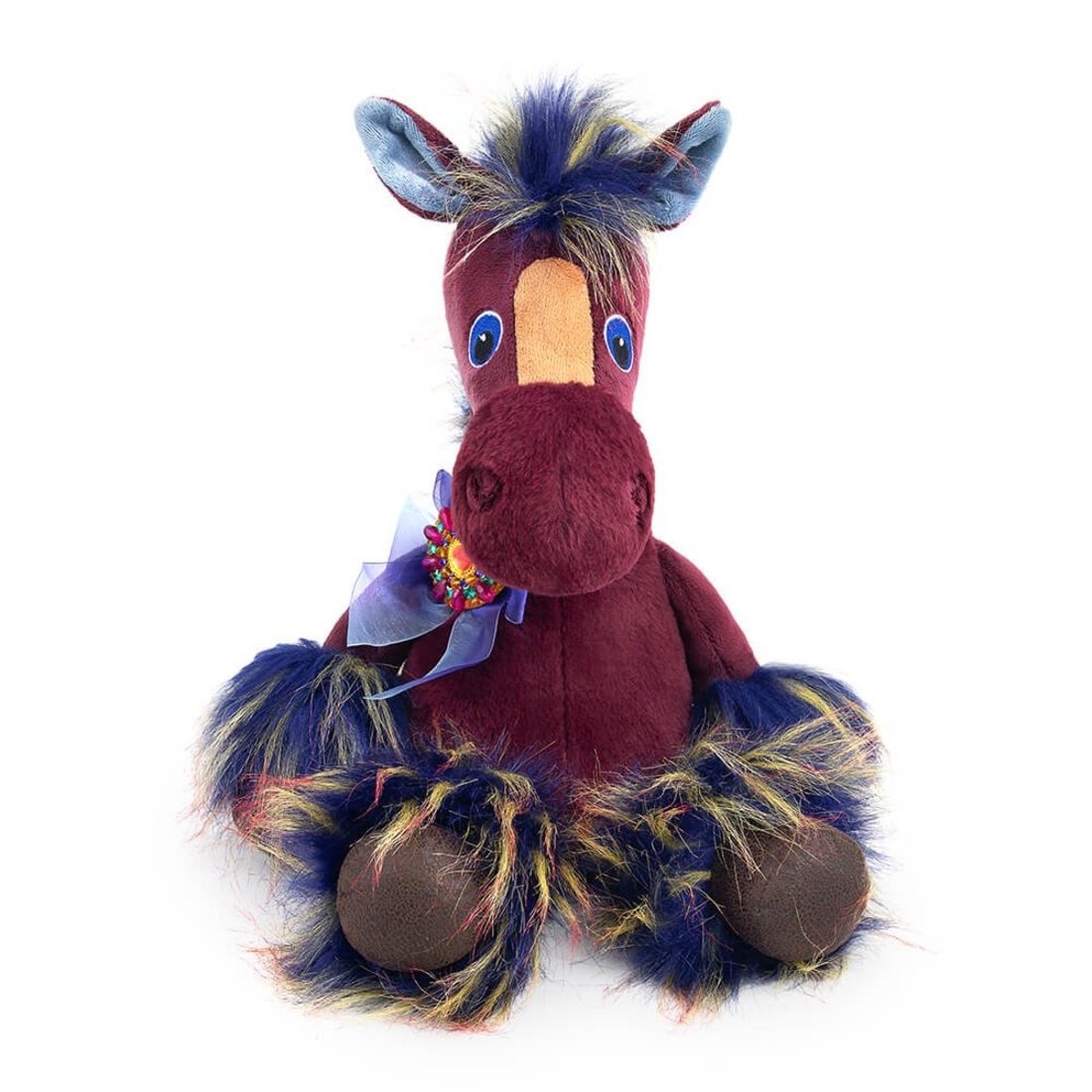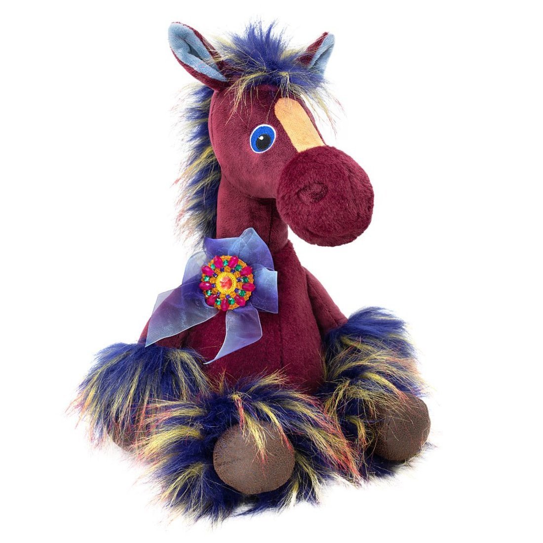Шикарный конь Патрик сшит из софта и короткого меха сложного бордового цвета. На мордочке вставка сливочного цвета, ярко-голубые глаза вышиты. В ушках вшит голубой софт. Грива и отделка ног из невероятно красивого длинного меха синего цвета с лимонными прядями с розовыми кончиками. На шее у Патрика богатый аксессуар в виде броши, расшитой разноцветными стразами. Брошь крепится на бант, завязанный из капроновой широкой ленты с эффектом деграде.