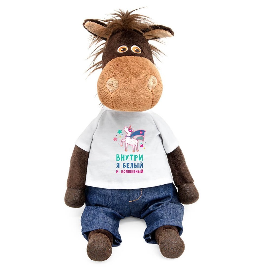 Конь Рэйв сшит из софта в песочно-шоколадных оттенках. Грива и хвост из длинного коричневого меха. Стильный Рэйв в белоснежной футболке из х/б трикотажа и тёмно-синих джинсах. Спереди на футболке термопринт с надписью «Внутри я белый и волшебный».