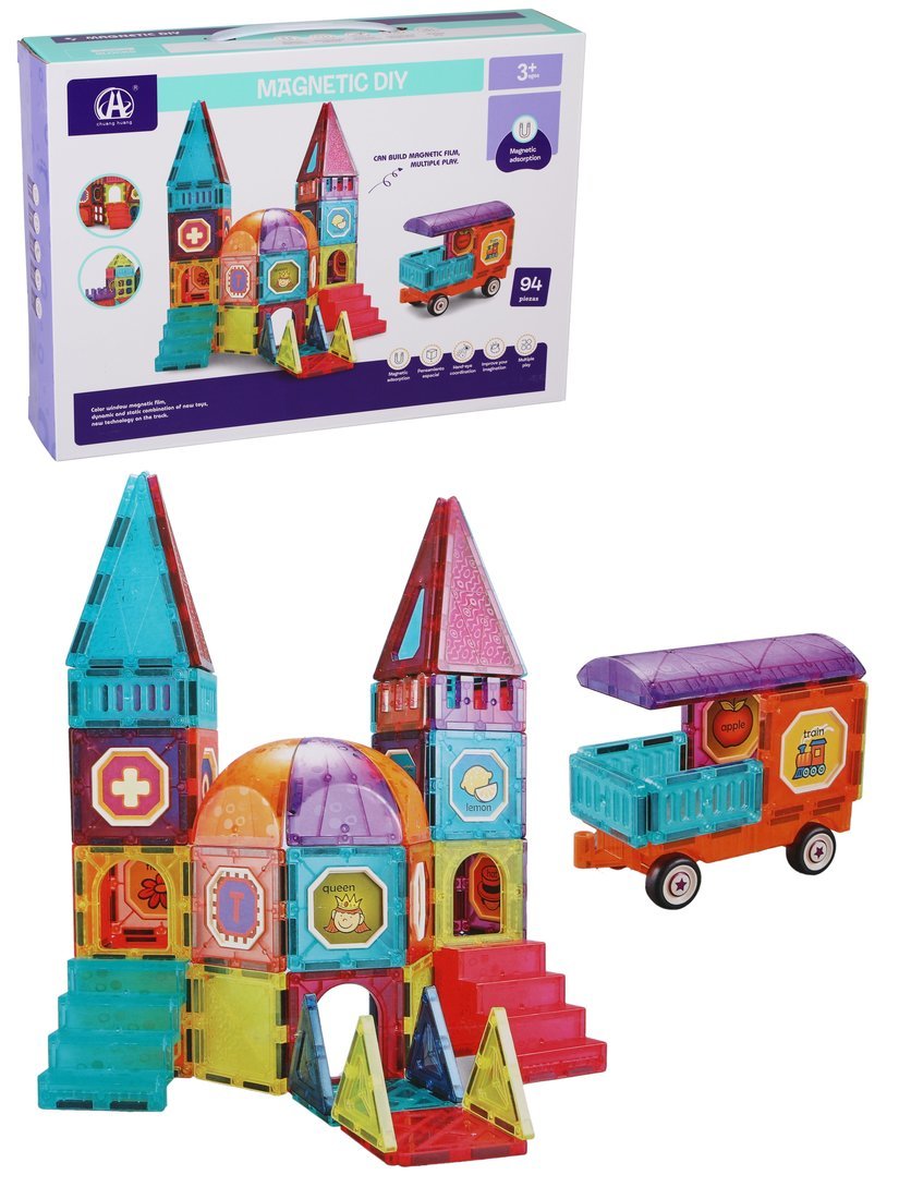Конструктор состоит из 94-х магнитных разноцветных пластиковых деталей в виде различных плоских геометрических фигур для сборки объемных конструкций.
