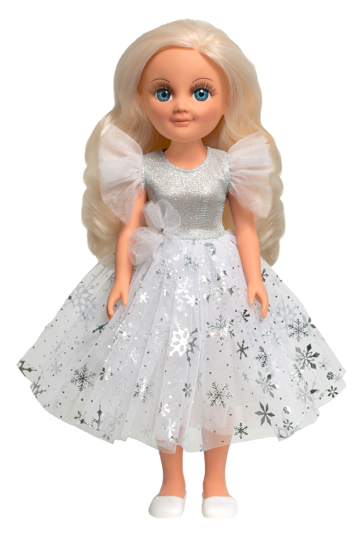 Кукла Анастасия Снежинка с выразительными глазами, пушистыми ресницами и роскошными волосами. На кукле пышное платье с серебристыми снежинками и балетки. Цветовая гамма одежды куклы, цвет глаз может варьироваться. Игровые возможности куклы: при нажатии на звуковое устройство, вставленное в спинку, кукла произносит фразы. Элементы кукольной одежды: застежки и обувь способствуют развитию мелкой моторики. Прекрасные длинные волосы, похожие на натуральные, можно завивать, расчёсывать и укладывать в разные причёски, меняя образ куклы. Продуманная конструкция куклы позволяет её сажать, ставить на ножки, переодевать.