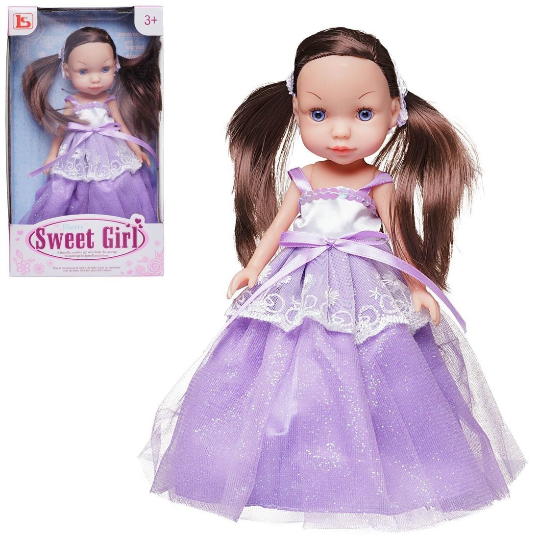 Симпатичная куколка с двумя игривыми хвостиками будет хорошим дополнением коллекции кукол девочки, ей обязательно понравится такая красивая новая подружка. У куклы миловидное лицо с большими голубыми выразительными глазами, длинные каштановые волосы. Кукла одета в красивое нарядное платье, сшитое из мерцающей нежно-фиолетовой ткани, дополнительно украшенное белыми кружевами и пайетками. У куколки подвижны руки и ноги, наряд можно снять, по желанию игрушку можно переодеть. Играя с ней, девочка сможет разыгрывать сценки, придумывая интересные сюжеты.