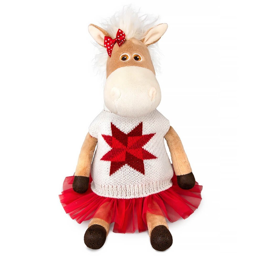Милая лошадка Лола сшита из софта в кремово-кофейных оттенках с коричневыми копытами из экокожи. На Лоле классный вязаный жилет белого цвета с орнаментом в виде трёхцветной норвежской звезды. К жилету пришита оборка из алой сеточки в виде юбочки. На ушке у лошадки атласный красный бантик в белый горошек.