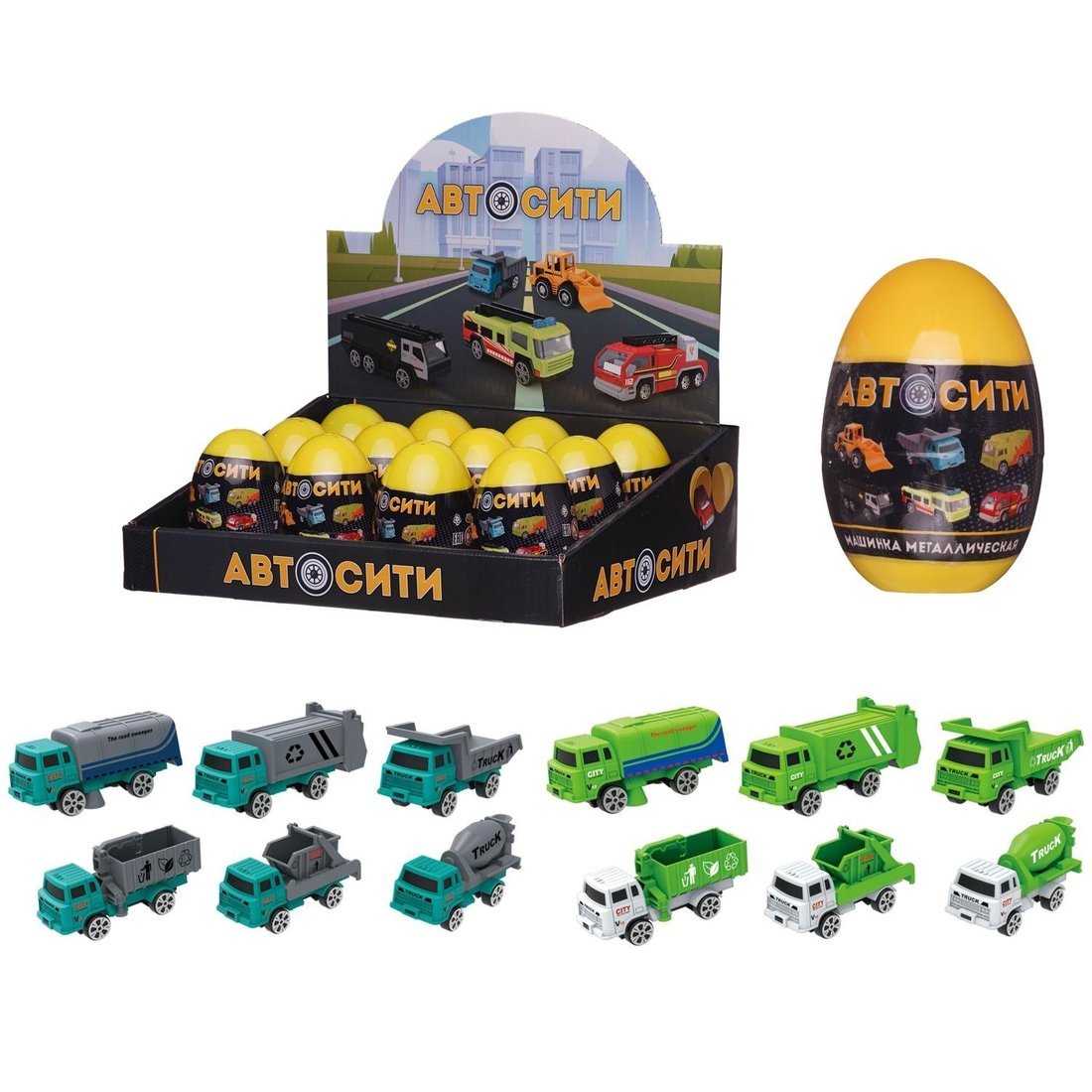 Игрушка представляет собой цветное пластиковое яйцо, внутри которого скрывает сюрприз – металлическая машинка-модель из серии «Городская уборочная техника». В серии представлены 12 различных моделей машинок. Они распределены в яйцах случайным образом, и угадать какая именно игрушка находится внутри - невозможно. Игрушка поможет развитию фантазии и воображения у ребенка, тренировке его мелкой моторики рук.