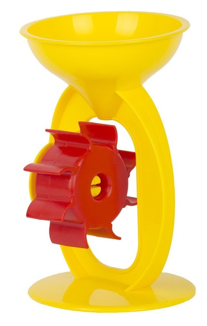 Игрушка «Мельница» заинтересует всех маленьких любознательных детей, которым интересно, каким образом устроен мир. Игрушка содержит в себе два отдельных элемента: мельницу и конус с отверстием. Благодаря установленному конусу, вещество, попадающее сверху, поступает вниз в отсеки мельницы. Накопив достаточное количество вещества на в одном отсеке, мельница опускается и процесс повторяется вновь. Таким образом и двигается мельница. В качестве исходного вещества ребёнок может использовать песок или воду.
