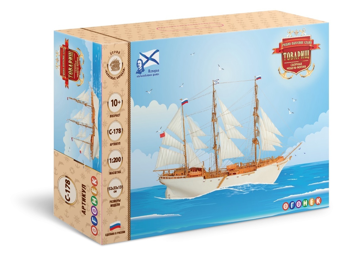 Собранная модель представляет собой уменьшенную копию самого крупного учебного корабля советского флота вплоть до Второй мировой войны - барка "Товарищ". Судно предназначалось для коммерческой торговли с Индией, отсюда большой размер и 4 мачты с парусами, чтобы вести больше груза и преодолевать большие расстояния. Модель имеет детально проработанную палубу, с запасными шлюпками на борту, 4 мачты с парусами и стропами, крепящимися к ним, и подставку.