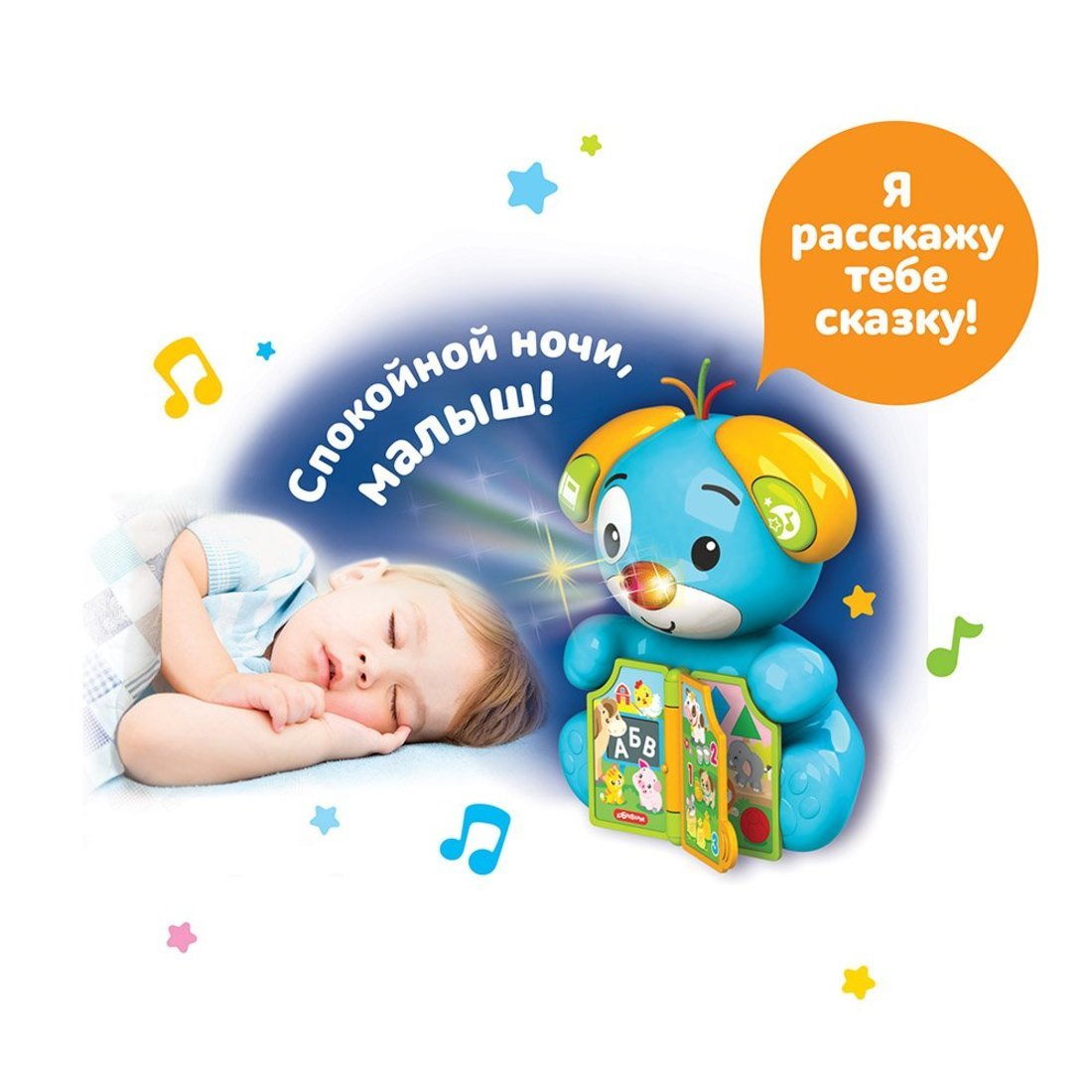 С этим интерактивным щенком ребенок сможет играть целый день! Умный щенок и поговорит с малышом, и споет ему обучающие песенки, и расскажет 7 любимых сказок («Гав-гав», «Репка», «Пузырь, Соломинка и Лапоть», «Два щенка», «Колобок», «Хвосты», «Курочка Ряба»). А если ребенок устанет, щенок сможет спеть ему колыбельные песенки – и малыш сладко заснет. Чтобы щенок заговорил или спел, нужно нажимать на кнопочки на его ушках и носике. В лапах у щенка – музыкальная книжечка, у которой перелистывается страничка. При каждом перелистывании звучит новая обучающая песенка: про буквы или цифры, формы или цвета, ферму или зоопарк. Носик у щенка светится – это делает игрушку еще более милой и забавной.