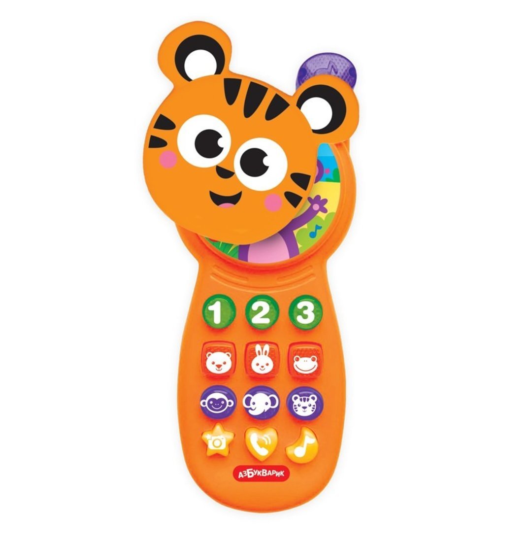 Большой телефончик для малышей в виде забавного тигренка с музыкальными кнопочками! Нажимая на кнопки, ребенок познакомится с цифрами, послушает 6 песенок про зверят, песенку про телефон, оригинальные рингтоны и другие звуки!