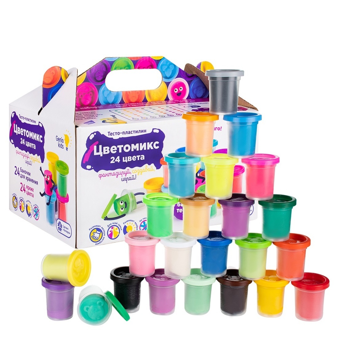 В набор входят 24 баночки с тестом-пластилином по 70гр, упакованы в коробку. Большой набор для детского творчества приведет в восторг ребенка, ведь теперь создавать поделки из тесто пластилина можно долго, а разнообразие цветов в наборе позволит вылепить фигурку на любую тематику. Тесто - пластилин - это отличный способ развития творческих способностей малышей. Лепка развивает мелкую моторику и воображение, знакомит с формами и цветами. В творческом наборе вы найдете 24 баночки с тесто-пластилином по 70 гр в каждой, всего 1 680 гр пластилина в одном наборе. Картонная коробка - контейнер имеет ручку, благодаря которой набор удобно брать с собой.