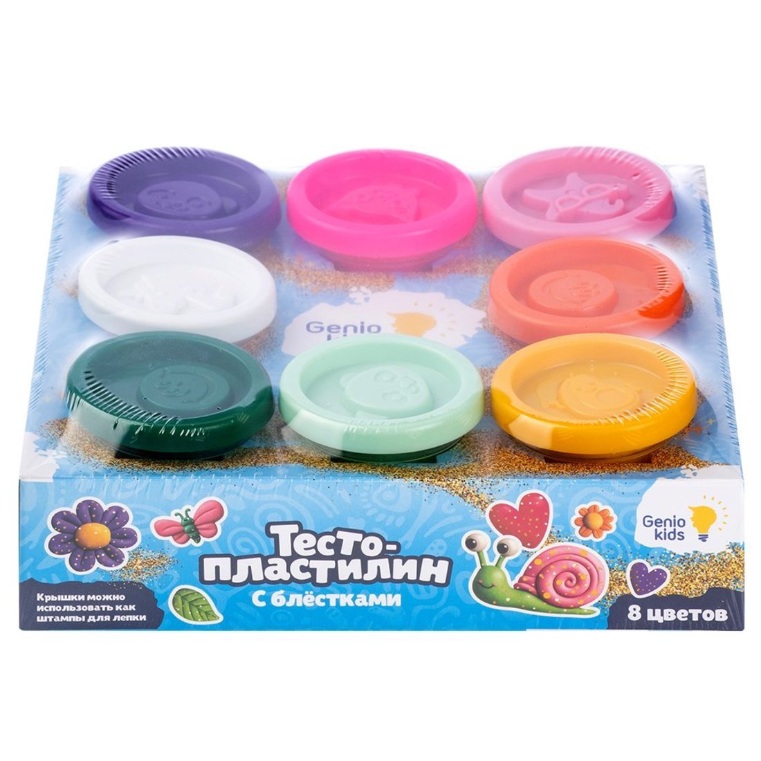 Тесто-пластилин с блестками для еще более яркой игры! 8 цветов теста по 50гр с блестками, каждый цвет в отдельной баночке. Тесто-пластилин Genio Kids - это отличный способ развития творческих способностей малышей. Не липнет к рукам, одежде и повнрхностям, не оставляет следов и не окрашивает руки и поверхности.