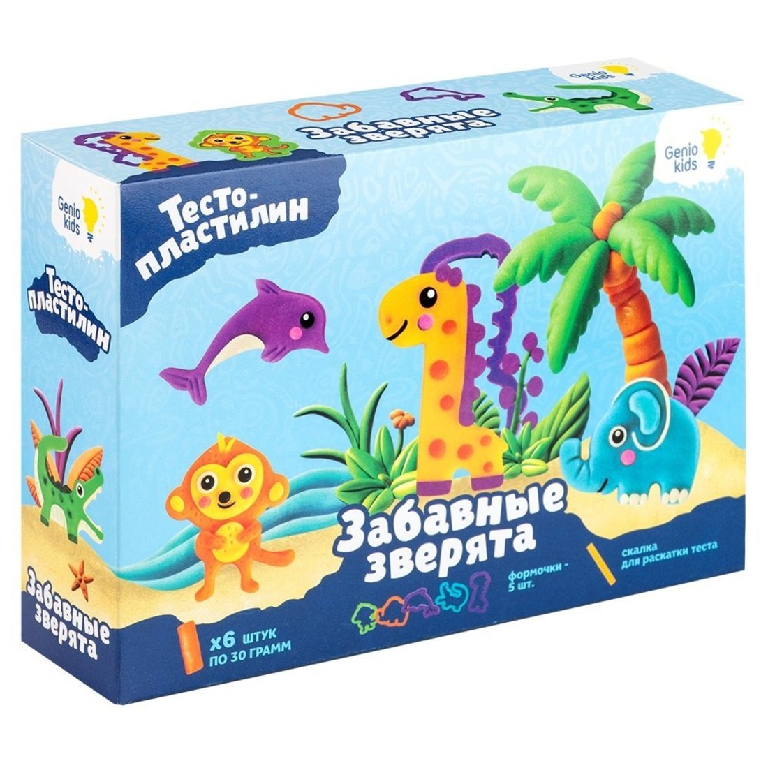 Набор, в который входит 6 брусков теста-пластилина по 30гр, 5 формочек в виде животных, скалка-труба
