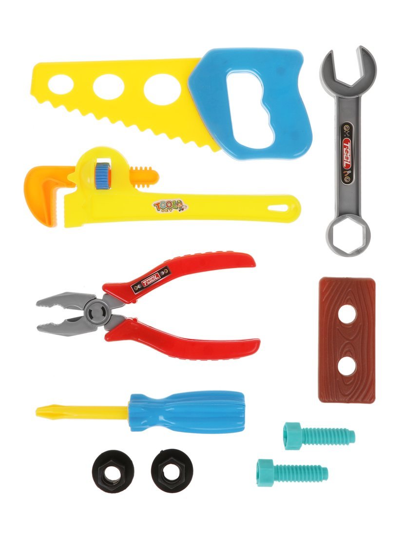 В комплекте 10 предметов: пила, гаечный ключ, плоскогубцы, прямоугольная деталь, имитирующая древесину, разводной ключ, два болта, две гайки и отвёртка.
