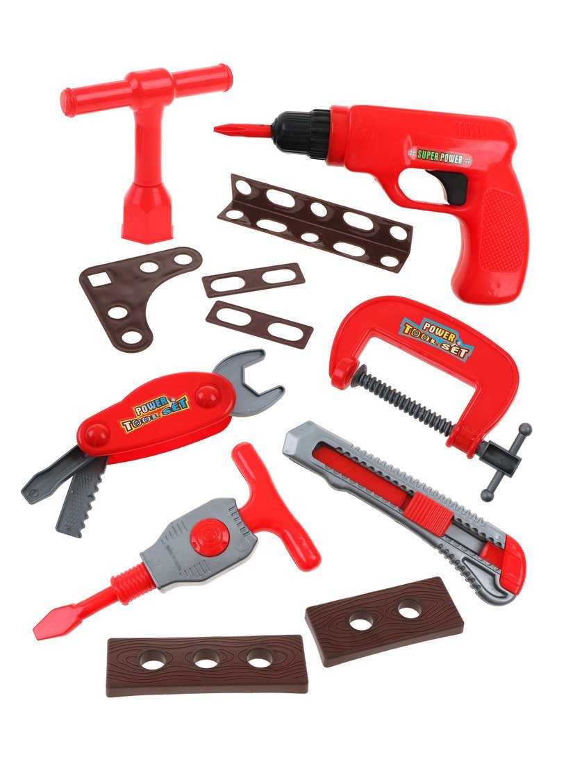 Набор игрушечных инструментов включает 12 предметов. В комплект входят: плоская отвертка, реверсивная отвертка, т-образный ключ, канцелярский ножик, мультитул, струбцина и 6 деталей с отверстиями. Все предметы являются муляжами и безопасны для использования маленькими детьми.
