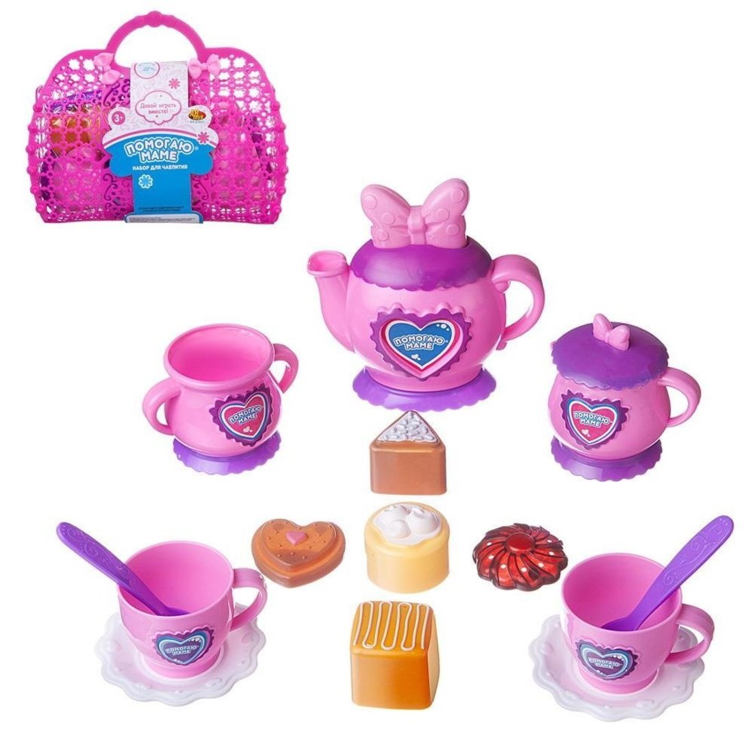Комплектность: сумочка – 1 шт., чайник – 1 шт., сахарница – 1 шт., молочник – 1 шт., чашка – 2 шт., ложки – 2 шт., тарелочки – 2 шт., пирожное – 5 шт.