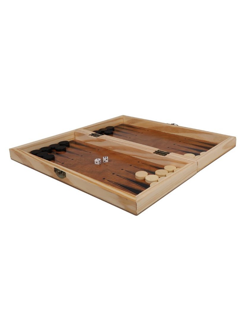 Набор для игр в шашки, шахматы и нарды. Размер поля в разложенном виде 29х29,5 см. Внешняя сторона поля - для шашек и шахмат, внутренняя - для нард. В набор также входят два игральных кубика. Игральная доска и все фигуры сделаны из дерева. Высота шахматных фигур - от 2,5 до 5 см.
