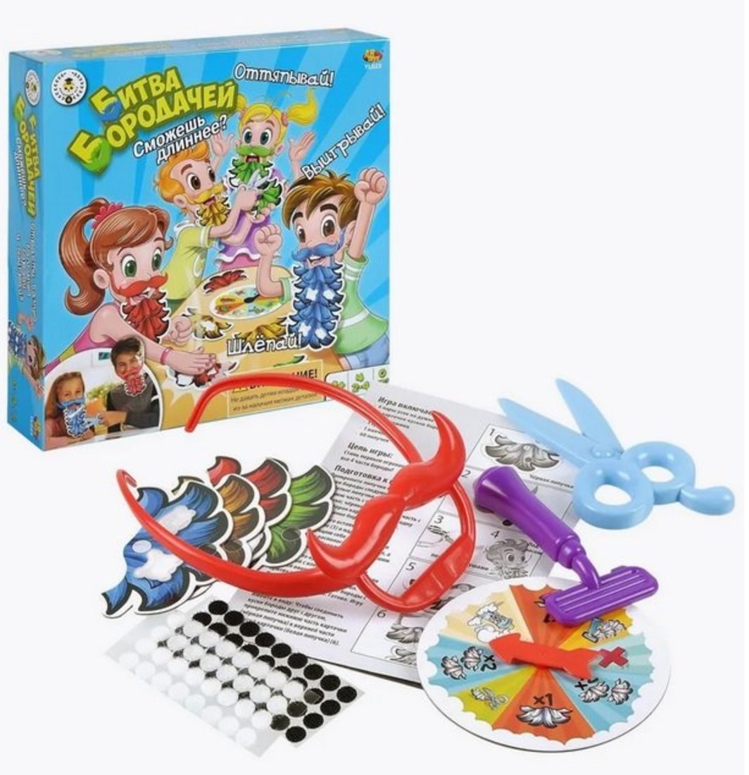 Веселая семейная настольна игра. Всегда мечтал о густой, стильной бороде?! Теперь у тебя есть шанс! Играй в Битву Бородачей с семьей и друзьями и попытайся первым отрастить самую длинную бороду! Ищи и прикрепляй карточки бороды своего цвета. Опасайся ночниц и бритвы, не успеешь оглянуться как твоя борода может вновь оказаться на игровом столе! Игрок собравший 4 куска бороды – выиграл!