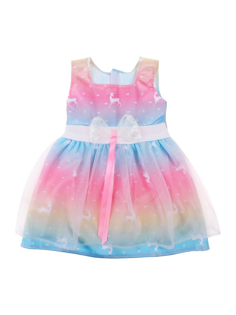 Любимая куколка девочки приглашена на празднование дня рождения подруги. В чем же ей пойти на праздник? Это платье, выполненное в ярких цветах, декорированное бантиком, прекрасно подойдет для такого случая.