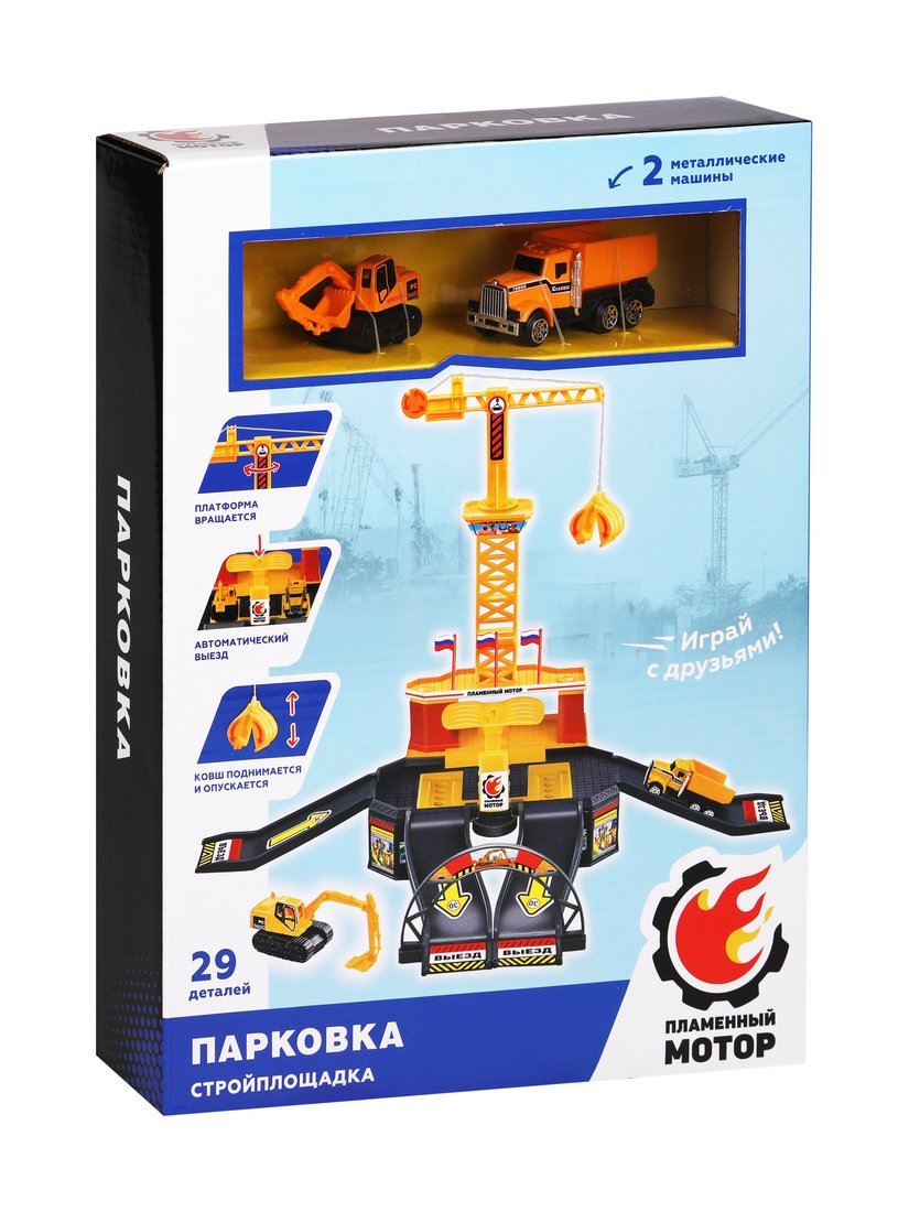 Игровой набор «Пламенный мотор» включает 2 металлические машины, 29 деталей для сборки паркинга, лист с наклейками и инструкцию.