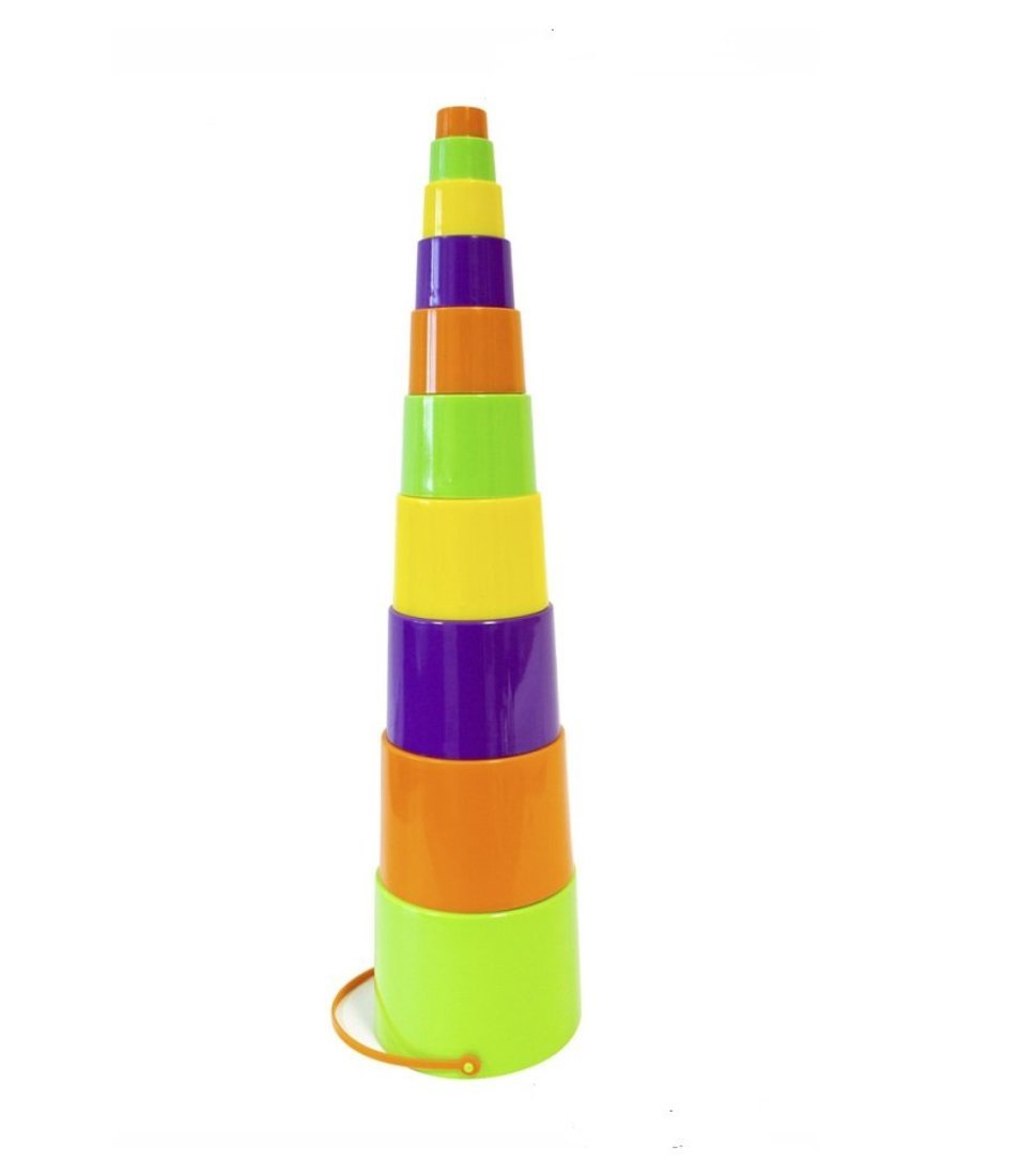 В состав пирамидки входит 1 ведерко и 9 стаканчиков разного диаметра и цвета. Размер стаканчиков подобран таким образом, чтобы они могли вставляться один в другой или выстраиваться в башенку.
