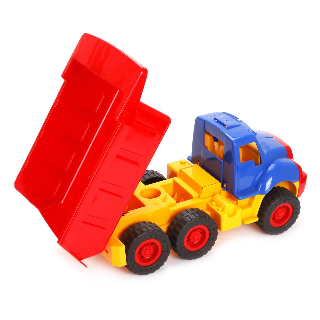 Самосвал "Мишка" сделан из пищевой пластмассы. Дополнительную безопасность при использовании автомобиля детьми младших возрастов, фактор немаловажный. Кузов самосвала подвижный. Техническое состояние отличное, готов перевезить самые разнообразные грузы. Выполнен в ярких красочных цветах.