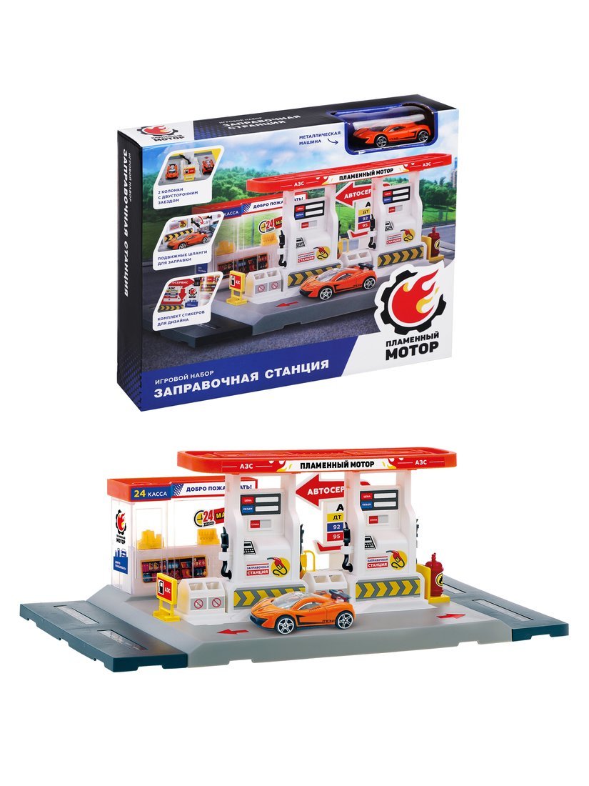 С этим игровым набором маленькая автозаправочная станция откроется прямо у вас дома! Игрушка отличается реалистичным дизайном и функционалом, что, несомненно, сделает игру максимально увлекательной для ребенка. Игрушечная автозаправка оснащена двумя колонками с двусторонним заездом, а также подвижными шлангами для заправки авто. Пошаговая иллюстрированная инструкция по сборке заправочной станции и металлическая машинка прилагаются в комплекте.