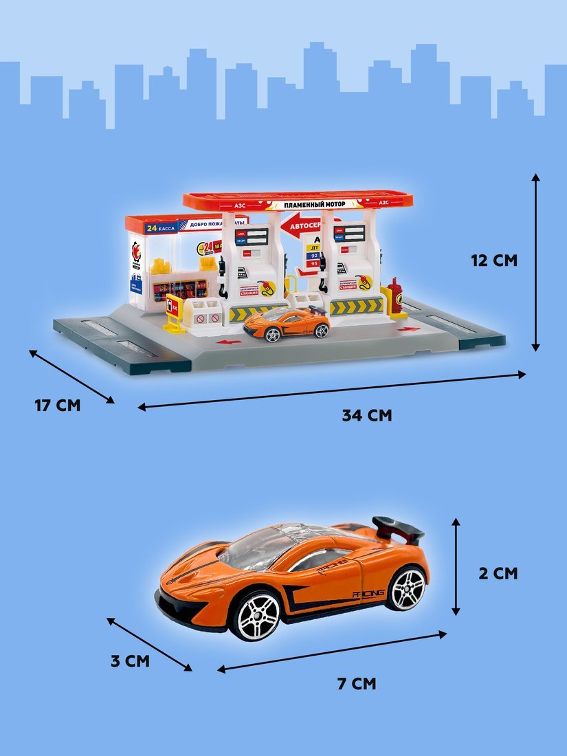 Размер заправочной станции в собранном виде (ДхШхВ): 34х17х12 см, размер машинки: 3х2х7 см.