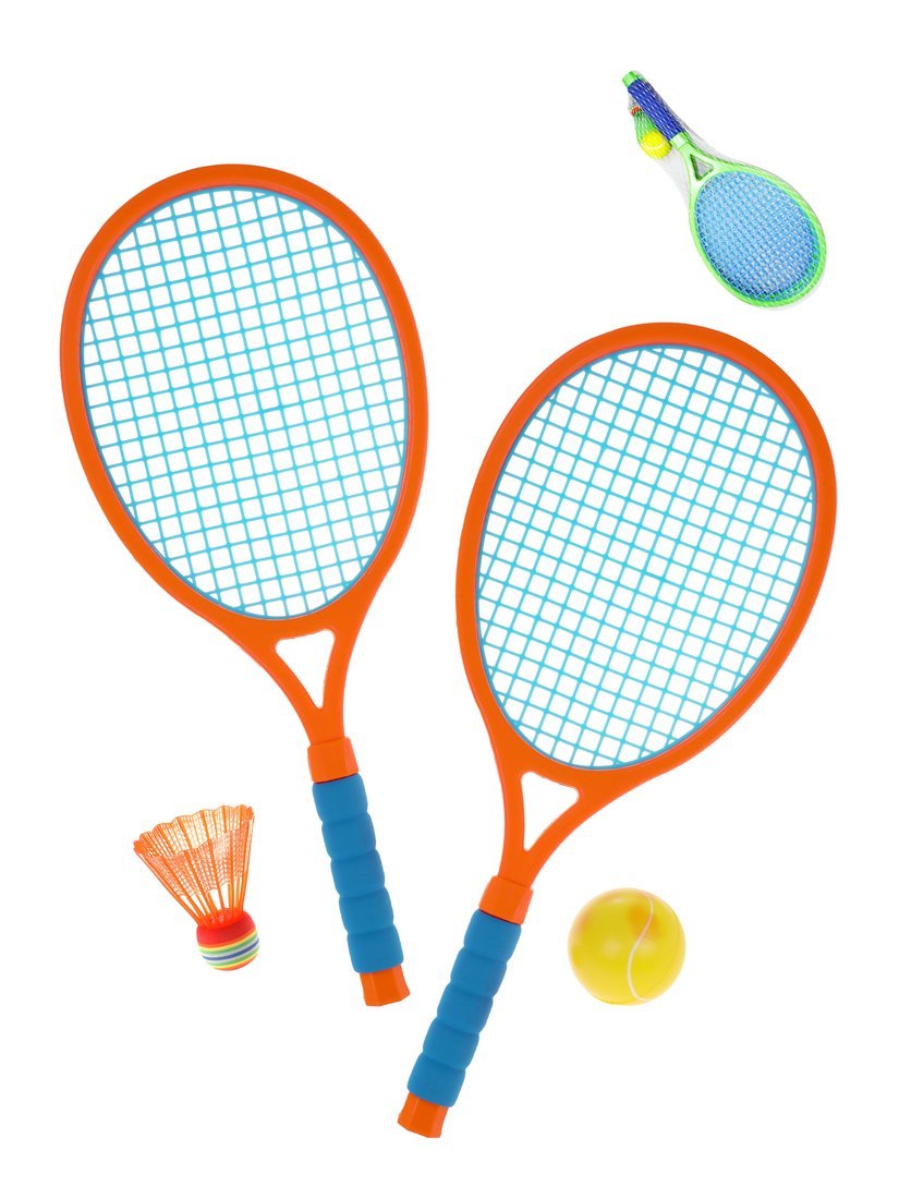 включает 2 ракетки длиной 29 см, волан и мяч. Цветовые варианты представлены в