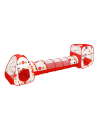 Размер палатки в разложенном виде (ДхШхВ) составляет 355х90х90 см. Размер куба (ДхШхВ) составляет 75х75х90 см. Размер пирамидальной части (ДхШхВ) составляет 88х88х90 см. Размер туннельной части (ДхШхВ) составляет 200х50х50 см. Части игрового комплекса можно соединить с помощью шнурков.Изготовлено из текстильных материалов с элементами пластмассы и металла. Рекомендованный возраст: 3 года +